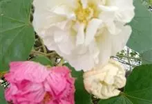 木芙蓉,锦葵科木槿属落叶灌木或小乔木。小枝上有细绒毛;叶片为卵状心形,托叶为披针形,常早落;花单生,花萼为钟形,花冠初为白色或淡红色,后逐渐变为深红色;果实为扁球形,有淡黄色的毛附着。花期8到10月。…全部>>