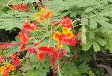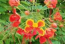 洋金凤 Sw.),豆科小凤花属灌木状或小乔木植物,枝无毛,绿或粉绿色;二回羽状复叶;总状花序伞房状,萼片无毛,花瓣橙红或黄色,圆形,花丝红色,子房无毛,花柱橙黄色;荚果窄而薄,…全部>>