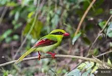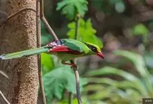 蓝绿鹊:中型鸟类,共有5个亚种。体长36-38厘米。尾长,嘴、脚红色。通体羽色主要为草绿色,宽阔的黑色贯眼纹向后延伸到后颈,在绿色的头侧极为醒目。两翅栗红色,内侧飞羽具黑色次端斑和白色尖端。尾绿色,…全部>>