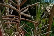 棒叶落地生根是景天科、落地生根属植物。茎直立、粉褐色。叶圆棒形,上表面有沟、粉色,有红褐斑。叶片交互对生,交叉排列成十字形。叶端锯齿上长有很小的幼株、落地后即可生根成活。原产非洲马达加斯加。…全部>>