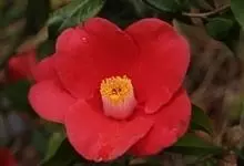 滇山茶:灌木至小乔木,有时高达15米,嫩枝无毛。叶阔椭圆形,上面干后深绿色,发亮,下面深褐色,无毛,侧脉6-7对,边缘有细锯齿。花顶生,红色,直径10厘米,无柄;苞片及萼片10-11片,花瓣红色,…全部>>