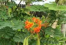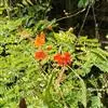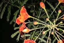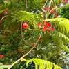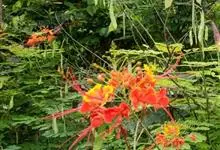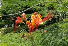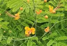 洋金凤 Sw.),豆科小凤花属灌木状或小乔木植物,枝无毛,绿或粉绿色;二回羽状复叶;总状花序伞房状,萼片无毛,花瓣橙红或黄色,圆形,花丝红色,子房无毛,花柱橙黄色;荚果窄而薄,…全部>>
