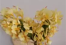 黄姜花:姜科,姜花属多年生草本草本芳香花卉,秋冬季开花,穗状花序,长圆形;苞片长椭圆形,覆瓦状排列,每一苞片内有花3-5朵;花深黄色,形似蝴蝶,气味芬芳纯正,沁人心脾;唇瓣倒心形,黄色,…全部>>