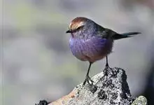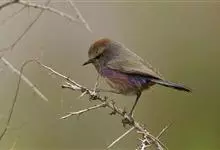 花彩雀莺:体长9-12厘米,是一种毛茸茸偏紫色的雀莺。顶冠棕色,眉纹白。尾长,羽毛松软。前额有一宽阔的眉纹淡黄色,头顶栗色或棕红色,有的具紫蓝色光泽。背灰色,腰和尾上覆羽辉紫蓝色,飞羽灰褐色。…全部>>