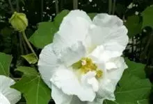 木芙蓉,锦葵科木槿属落叶灌木或小乔木。小枝上有细绒毛;叶片为卵状心形,托叶为披针形,常早落;花单生,花萼为钟形,花冠初为白色或淡红色,后逐渐变为深红色;果实为扁球形,有淡黄色的毛附着。花期8到10月。…全部>>