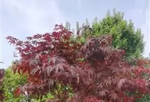 红枫,园艺种,槭树科槭属落叶小乔木,高5~8 m;树冠伞形,枝条开张,细弱。单叶对生,近圆形,薄纸质,掌状7~9深裂,裂深常为全叶片的1/2~1/3,基部心形,裂片卵状长椭圆形至披针形,先端尖,…全部>>