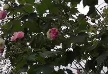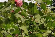 木芙蓉,锦葵科木槿属落叶灌木或小乔木。小枝上有细绒毛;叶片为卵状心形,托叶为披针形,常早落;花单生,花萼为钟形,花冠初为白色或淡红色,后逐渐变为深红色;果实为扁球形,有淡黄色的毛附着。花期8到10月。…全部>>