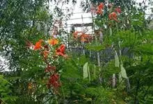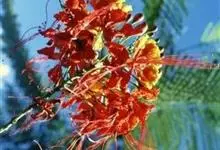 洋金凤 Sw.),豆科小凤花属灌木状或小乔木植物,枝无毛,绿或粉绿色;二回羽状复叶;总状花序伞房状,萼片无毛,花瓣橙红或黄色,圆形,花丝红色,子房无毛,花柱橙黄色;荚果窄而薄,…全部>>