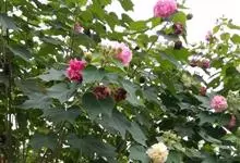 木芙蓉,锦葵科木槿属落叶灌木或小乔木。小枝上有细绒毛;叶片为卵状心形,托叶为披针形,常早落;花单生,花萼为钟形,花冠初为白色或淡红色,后逐渐变为深红色;果实为扁球形,有淡黄色的毛附着。花期8到10月。…全部>>