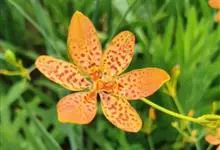 射干 Redouté)是鸢尾科射干属多年生草本植物。根状茎为不规则的块状,斜黄色或黄褐色;花橙红色,散生紫褐色的斑点;花药呈条形;子房下位,倒卵形;蒴果倒卵形或长椭圆形;种子圆球形,黑紫色,有光泽。…全部>>