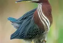 绿鹭:是鹳形目鹭科绿鹭属鸟类。体型小,头顶黑,枕冠亦黑色,上体蝉灰绿色,下体两侧银灰色;前额至后枕及冠羽墨绿色,眼后有一白斑,颊纹黑色;颚纹白色,后颈、颈侧和体侧烟灰色;背部披灰绿色矛状长羽,…全部>>