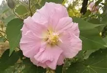 木芙蓉,锦葵科木槿属落叶灌木或小乔木。小枝上有细绒毛;叶片为卵状心形,托叶为披针形,常早落;花单生,花萼为钟形,花冠初为白色或淡红色,后逐渐变为深红色;果实为扁球形,有淡黄色的毛附着。花期8到10月。…全部>>