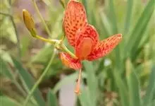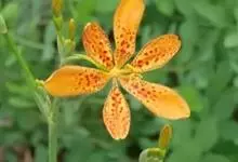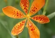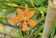 射干 Redouté)是鸢尾科射干属多年生草本植物。根状茎为不规则的块状,斜黄色或黄褐色;花橙红色,散生紫褐色的斑点;花药呈条形;子房下位,倒卵形;蒴果倒卵形或长椭圆形;种子圆球形,黑紫色,有光泽。…全部>>