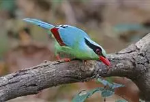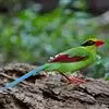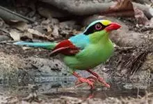 蓝绿鹊:中型鸟类,共有5个亚种。体长36-38厘米。尾长,嘴、脚红色。通体羽色主要为草绿色,宽阔的黑色贯眼纹向后延伸到后颈,在绿色的头侧极为醒目。两翅栗红色,内侧飞羽具黑色次端斑和白色尖端。尾绿色,…全部>>