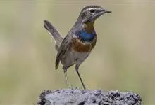 蓝点颏亦称“蓝喉歌鸲”,通称蓝靛颏儿。身体大小和麻雀相似,体长12-13厘米,体重17-18克。头部、上体主要为土褐色。眉纹白色。尾羽黑褐色,基部栗红色。颏部、喉部辉蓝色,下面有黑色横纹。下体白色。…全部>>