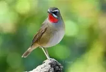 红点颏:是鸟纲、鹟科的鸣禽。又名西伯利亚歌鸲。体长14-17厘米,体重16-27克。雄鸟头部、上体主要为橄榄褐色。眉纹白色。颏部、喉部红色,周围有黑色狭纹。胸部灰色,腹部白色。雌鸟颏部、喉部不呈赤红色,…全部>>