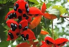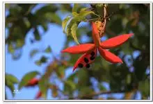 假苹婆是锦葵科苹婆属乔木植物。幼枝被毛;叶椭圆形或披针形,先端骤尖,基部钝或近圆无毛;圆锥花序腋生,花淡红色;蓇葖果鲜红色,长卵圆形或长椭圆形;种子卵圆形黑褐色;花期4-6月。…全部>>