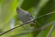 白腹凤鹛是绿鹃科、绿凤鹛属的小型鸟类,体长10-12厘米。上体从头到尾黄绿色,有短的羽冠,头顶微具黑色羽轴纹;眼先、眼周,耳羽和下体灰白色,尾下覆羽黄色。虹膜褐色或红褐色,上嘴浅褐色或肉褐色,…全部>>