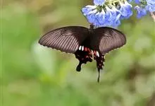 玉斑凤蝶Papilio helenus 别名白纹凤蝶,是凤蝶科凤蝶属美凤蝶亚属大型种类。雌雄同型;体翅皆黑色,后翅正面中室外有3个并列的白色斑,亚外缘有1列模糊的新月形红色斑,…全部>>