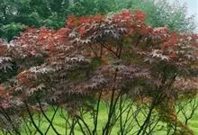红枫,园艺种,槭树科槭属落叶小乔木,高5~8 m;树冠伞形,枝条开张,细弱。单叶对生,近圆形,薄纸质,掌状7~9深裂,裂深常为全叶片的1/2~1/3,基部心形,裂片卵状长椭圆形至披针形,先端尖,…全部>>