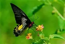 金裳凤蝶是凤蝶科、裳凤蝶属的动物。金裳凤蝶身体呈黑色,头、颈和胸侧有红毛,腹部有黑黄两色相间条纹,雄蝶前翅黑色,具黑天鹅绒光泽,各脉两侧灰白色,后翅金黄色,各室外缘有等腰三角形黑斑1枚,斑内侧有晕,…全部>>