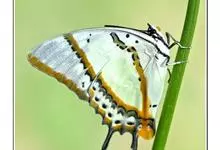 大二尾蛱蝶两翅正面黑色,中域有一浅绿色大型宽带纹,两翅反面浅绿色,中域有一缀黑边的褐色弧纹,亚外缘还有一深褐色横纹,后翅各有尾突两条,…全部>>