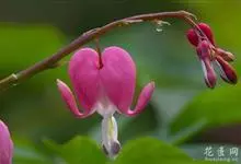 荷包牡丹 Fukuhara),是罂粟科荷包牡丹属的多年生草本植物,株高30-60厘米,具肉质根状茎;茎直立呈圆柱形;叶二回三出全裂,状似牡丹叶;总状花序顶生,基部为心形,花瓣紫红色至粉红色,稀白色,…全部>>