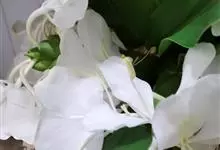 姜花又名野姜花。是姜科姜花属的多年生草本植物,茎高1-2米;叶片长圆状披针形或披针形,叶面光滑,叶背被短柔毛;穗状花序顶生,椭圆形,花芬芳,白色;蒴果卵状三棱形,微黄绿色;种子鲜红色,具橘红色的假种皮。…全部>>