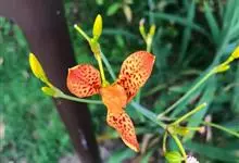 射干 Redouté)是鸢尾科射干属多年生草本植物。根状茎为不规则的块状,斜黄色或黄褐色;花橙红色,散生紫褐色的斑点;花药呈条形;子房下位,倒卵形;蒴果倒卵形或长椭圆形;种子圆球形,黑紫色,有光泽。…全部>>