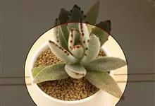 褐斑伽蓝是景天科伽蓝菜属的多年生多肉类植物,茎直立,多分枝,叶生于枝上,肉质叶片匙形,上面密被白色绒毛,下部全缘,叶缘上部有缺刻,缺刻处有深褐或棕色斑块。褐斑伽蓝原产非洲的马达加斯加岛。…全部>>
