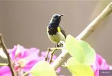 黄腹花蜜鸟是雀形目太阳鸟科花蜜鸟属鸟类。体型较小、喙略短而弯、腹部黄色。雄鸟繁殖季节颏及胸黑紫色并泛金属光泽,具有绯红色及灰色胸带,将上腹部黑色斑与前胸隔开,肩斑为橙黄色丝质羽,上体橄榄绿色,…全部>>
