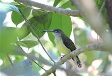 长嘴捕蛛鸟,小型鸟类,体长14-16厘米。嘴长而尖向下弯曲。上体橄榄绿色,眼先和短眉灰白色,两翅和尾暗褐色,外翈羽缘橄榄绿色,羽端灰褐色,自嘴基沿喉侧有一黑色纵纹。颏、喉灰白色,其余下体鲜黄色,…全部>>