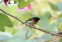 黄腹花蜜鸟是雀形目太阳鸟科花蜜鸟属鸟类。体型较小、喙略短而弯、腹部黄色。雄鸟繁殖季节颏及胸黑紫色并泛金属光泽,具有绯红色及灰色胸带,将上腹部黑色斑与前胸隔开,肩斑为橙黄色丝质羽,上体橄榄绿色,…全部>>