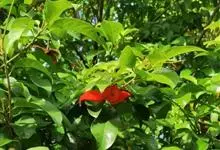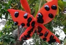 假苹婆是锦葵科苹婆属乔木植物。幼枝被毛;叶椭圆形或披针形,先端骤尖,基部钝或近圆无毛;圆锥花序腋生,花淡红色;蓇葖果鲜红色,长卵圆形或长椭圆形;种子卵圆形黑褐色;花期4-6月。…全部>>