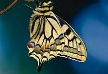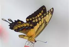 金凤蝶,是鳞翅目凤蝶科凤蝶属动物。金凤蝶为中型凤蝶,翅展70-84毫米,翅背面底色黑褐色,翅脉黑色,翅室具黄斑;前翅背面基部呈暗黄色,亚外缘为黑色,内具一列小黄斑;后翅背面亚外缘区具黑宽边,…全部>>