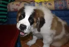 圣伯纳犬,别名巴里汉德,属于大型工作犬,肩高约65~90厘米,体重约50~90千克。圣伯纳犬身体强壮,被毛红褐色和白色相间,头圆而宽大。颈部强壮,胸宽深,背直。前肢长直,腕关节略前倾,后肢腿骨粗壮,…全部>>