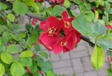 贴梗海棠 Nakai)是蔷薇科、木瓜海棠属植物。落叶灌木,高达2米,枝条直立开展,有刺。叶片卵形至椭圆形,稀长椭圆形,长3-9厘米,宽1.5-5厘米。花先叶开放,3-5朵簇生于二年生老枝上。…全部>>