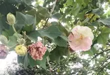 木芙蓉,锦葵科木槿属落叶灌木或小乔木。小枝上有细绒毛;叶片为卵状心形,托叶为披针形,常早落;花单生,花萼为钟形,花冠初为白色或淡红色,后逐渐变为深红色;果实为扁球形,有淡黄色的毛附着。花期8到10月。…全部>>