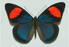 天堂凤蝶翅展可达105mm。前、后翅自基角至后缘约1/2~2/3端为纯净的宝蓝色,后角至后缘1/3~1/2端为黑色,后翅有黑色的尾突。翅背面为棕褐色。全部>>