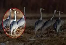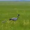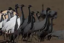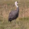 蓑羽鹤大型涉禽,体长68~92厘米,是鹤类中个体最小者。通体蓝灰色,眼先、头侧、喉和前颈黑色,眼后有一白色耳簇羽极为醒目。前颈黑色羽延长,悬垂于胸部。脚黑色,飞翔时翅尖黑色。…全部>>