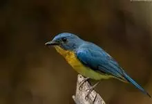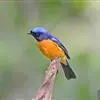 山蓝仙鹟:小型鸟类,体长13-15厘米。雄鸟额基和眼先黑色,颏橙棕色,仅颏尖为蓝黑色,喉、胸、上腹和两胁亦为橙棕色,下体白色范围较小,仅局限于下腹和尾下覆羽。雌鸟上体少黄色,颏、喉、胸概为锈红色,…全部>>