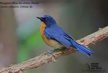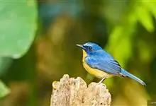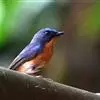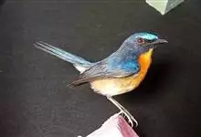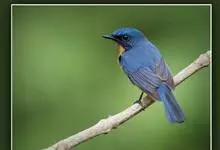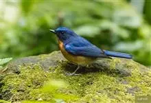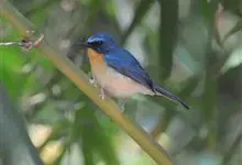 棕腹大仙鹟:体重24-28克,体长15-17厘米,是一种小型的色彩亮丽的鹟。雄鸟上体深蓝,下体棕色,脸黑,额、颈侧小块斑、翼角及腰部亮丽闪辉蓝色。与棕腹仙鹟易混淆,区别在色彩较暗。雌鸟灰褐,…全部>>