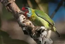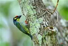 金喉拟啄木鸟,是须鴷科、拟啄木鸟属的鸟类。金喉拟啄木鸟为小型鸟类,体长19-24厘米。额深红色,头顶金黄色,后枕具一大块深红色斑,耳羽和头侧银灰色,上体草绿色,颏和上喉金黄色,下喉淡银灰色,…全部>>