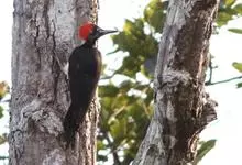 白腹黑啄木鸟,是啄木鸟科、黑啄木鸟属的中型鸟类,体长43-46厘米,头顶具长的红色羽冠,颚纹亦为红色,其余头、颈、胸和上体黑色,腰和腹白色,飞翔时白色腋羽和翅下覆羽亦明显可见。雌鸟头顶黑色,…全部>>