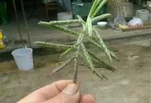 棒叶落地生根是景天科、落地生根属植物。茎直立、粉褐色。叶圆棒形,上表面有沟、粉色,有红褐斑。叶片交互对生,交叉排列成十字形。叶端锯齿上长有很小的幼株、落地后即可生根成活。原产非洲马达加斯加。…全部>>