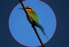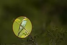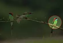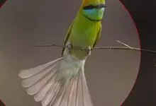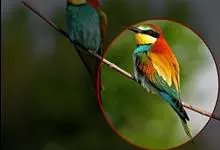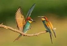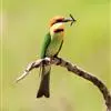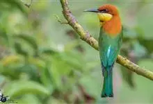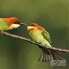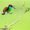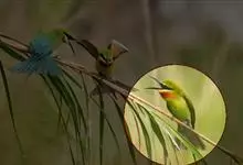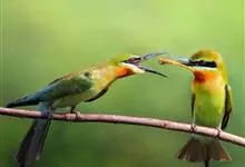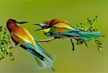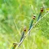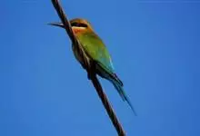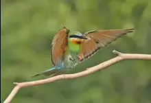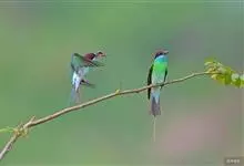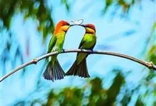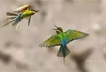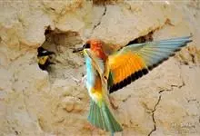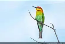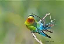栗喉蜂虎是蜂虎科蜂虎属的鸟类。有热带鸟类羽毛艳丽的特征:喉部是栗红色的,黑色的过眼纹,翅膀和背部是绿色的,尾翼是蓝色的,飞行时翅膀下面的羽毛是橙黄色的,在阳光的照射下,它们全身闪烁着金属般的艳丽光泽,…全部>>