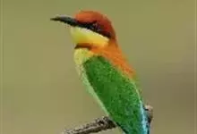 栗喉蜂虎是蜂虎科蜂虎属的鸟类。有热带鸟类羽毛艳丽的特征:喉部是栗红色的,黑色的过眼纹,翅膀和背部是绿色的,尾翼是蓝色的,飞行时翅膀下面的羽毛是橙黄色的,在阳光的照射下,它们全身闪烁着金属般的艳丽光泽,…全部>>