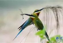 蓝颊蜂虎:是蜂虎科、蜂虎属的鸟类,共有2个亚种。体长27-33厘米,翼展46-49厘米,体重38-50克。嘴形细长而下弯,先端尖,…全部>>
