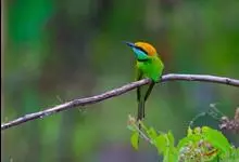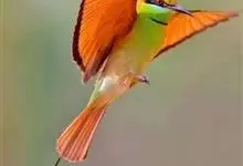 绿喉蜂虎是佛法僧目、蜂虎科的小型鸟类,共有9个亚种。身长22-25厘米,翼展29-30厘米,体重15-20克。喉绿色,额部、头顶至上背为锈红色,其余上体均为亮绿色。中央尾羽延长且端段狭细,…全部>>