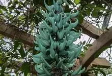 翡翠葛是豆科翡翠葛属植物,多年生常绿大型藤本,茎木质,直径可达30厘米,长可达21.3米。三出复叶,革质光亮,小叶长椭圆形,长7.6-12.7厘米,中间小叶最长。花两性,春季至初夏开花,蓝绿色,…全部>>